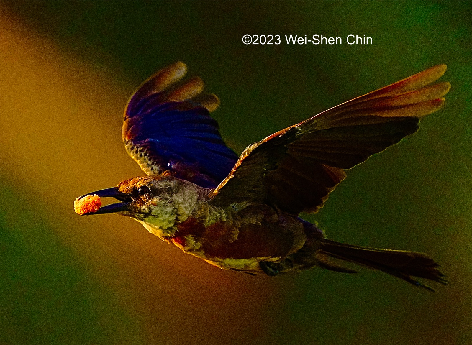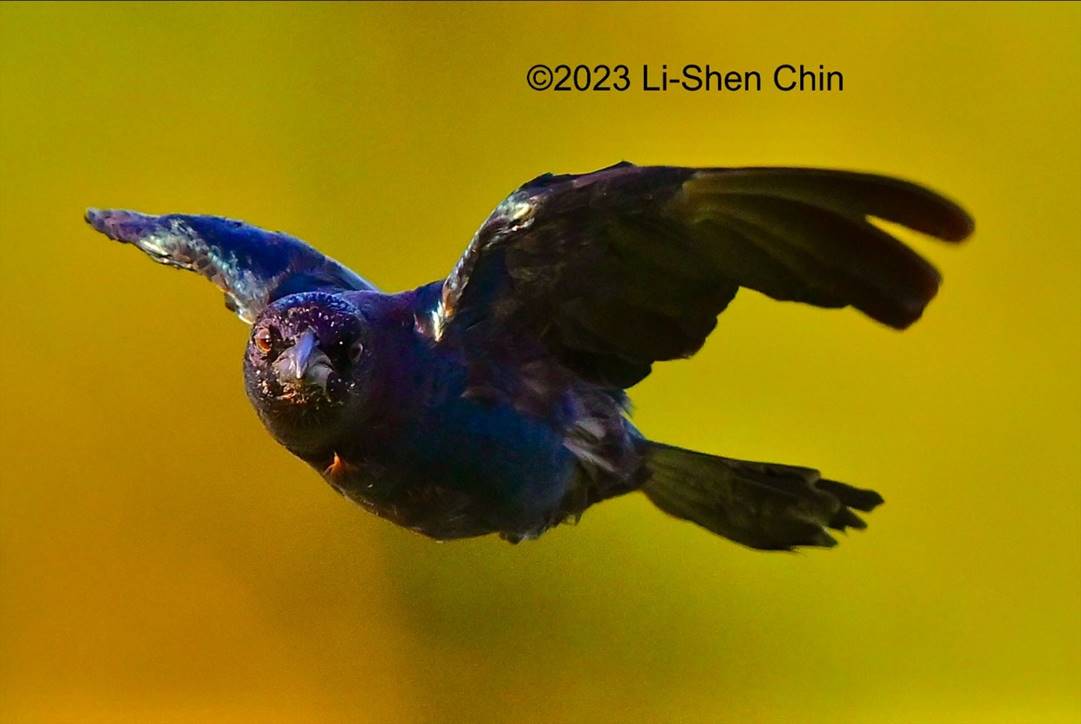 capturing this grackle in flight with his food morsel and a perfectly