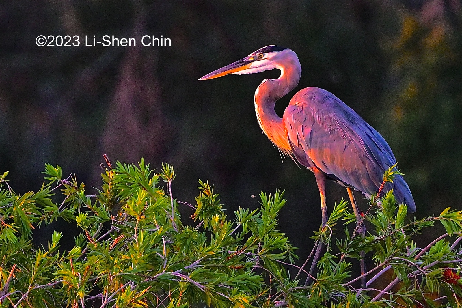 great blue heron bathed in the morning sunlight, a female grackle perched on a