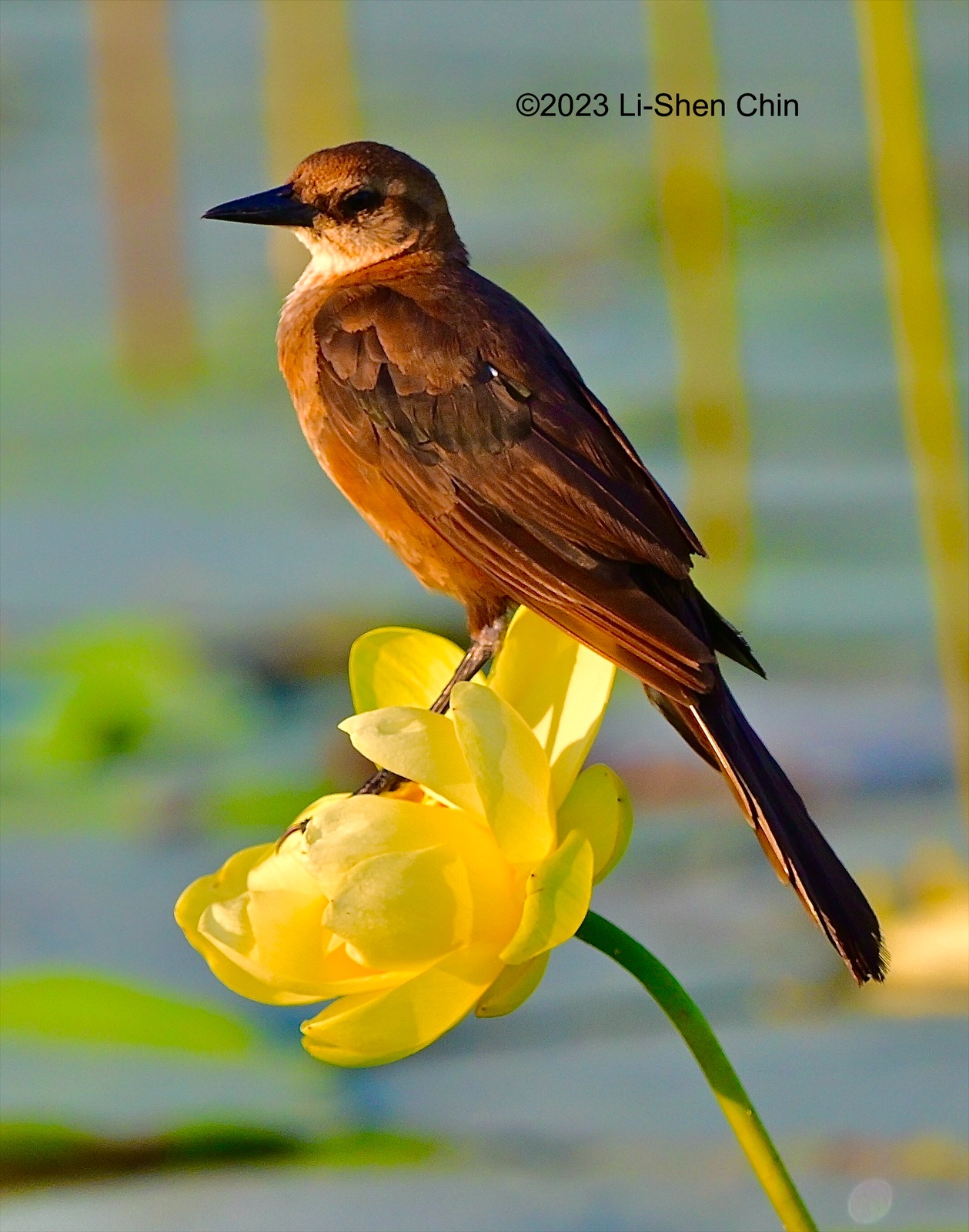 water lily, a male grackle with a catch in his mouth, and a silhouette of an